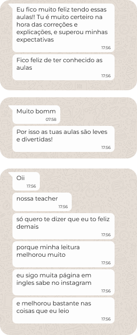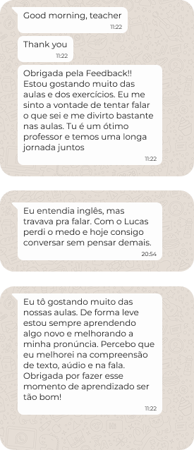 Onde dei meus primeiros passos como professor de inglês. Foi aqui que consolidei minha prática em sala de aula e minha base pedagógica. Nesse período, foquei em criar aulas dinâmicas e acompanhar de perto a evolução de cada aluno, o que foi fundamental para eu desenvolver meu próprio jeito de ensinar.